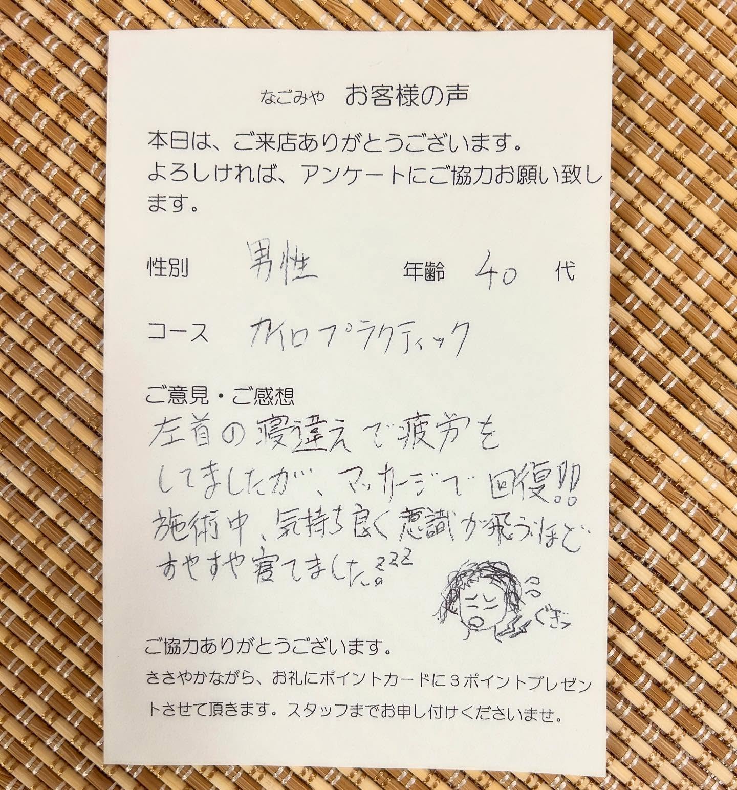 施術中、気持ち良く意識が飛ぶほどすやすや寝ていました。」
