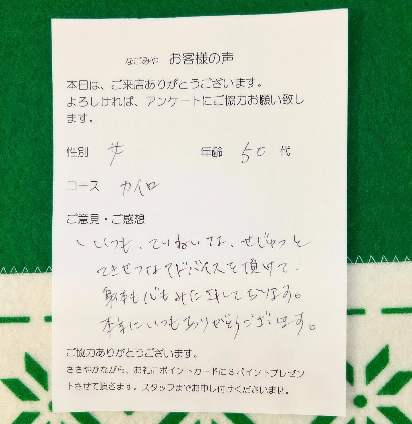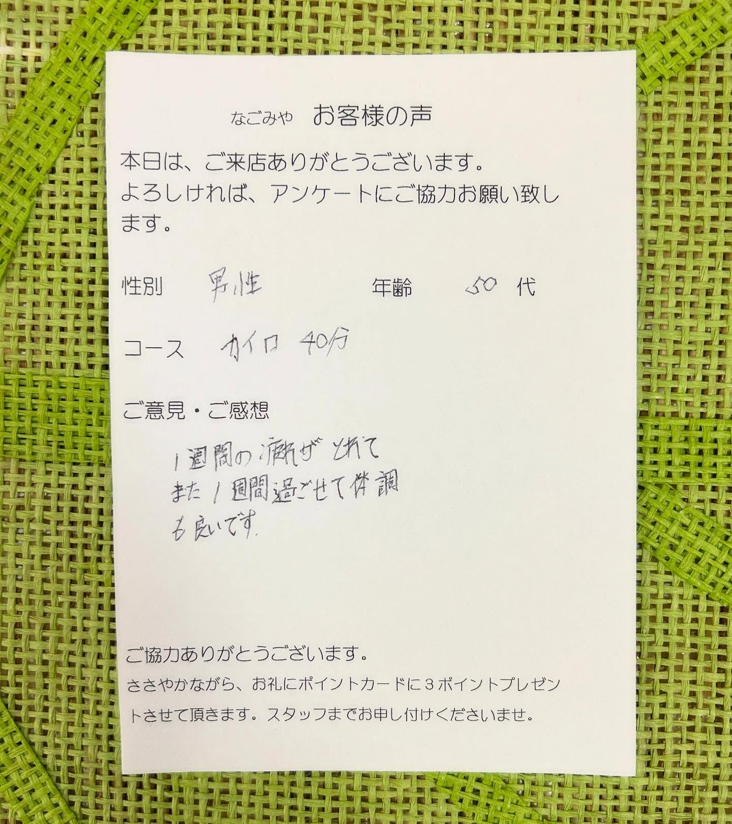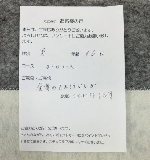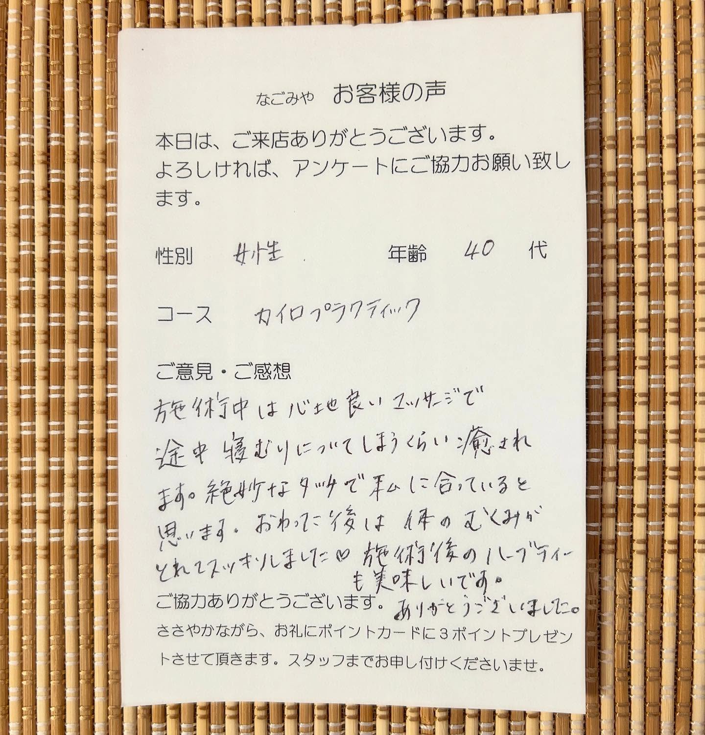 「いつも、ていねいなせじゅつと、てきせつなアドバイスを頂けて、身体も心もみたされております。